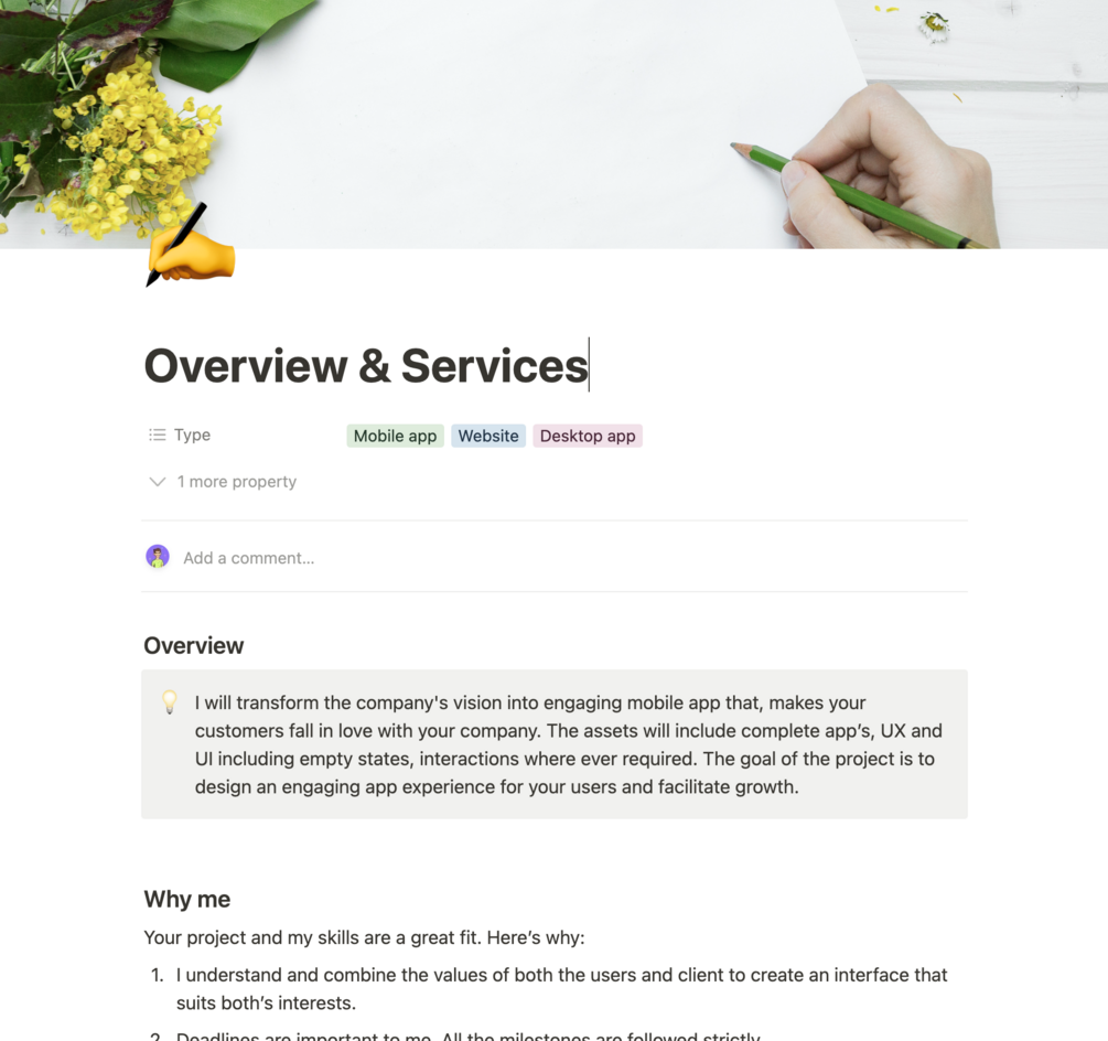 - In the Overview section, you can provide background information about yourself as the designer, highlighting your qualifications and expertise in the field. Additionally, in the "Why me" section, you explain what sets you apart from other designers and how you can bring value to a client's project.
