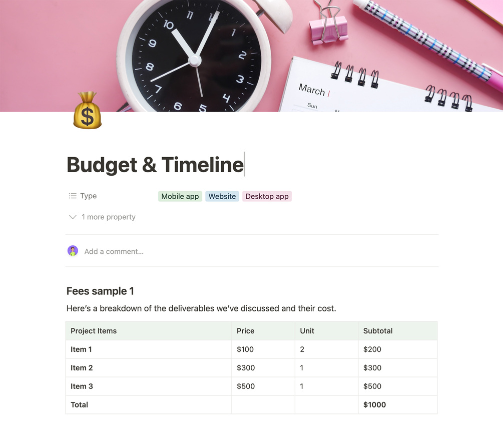 - When it comes to budget and timeline, my template includes two tables that make it easy to keep track of expenses and stay on track with project deadlines. With these tools, you can rest assured that your project will be completed on time and within your budget.